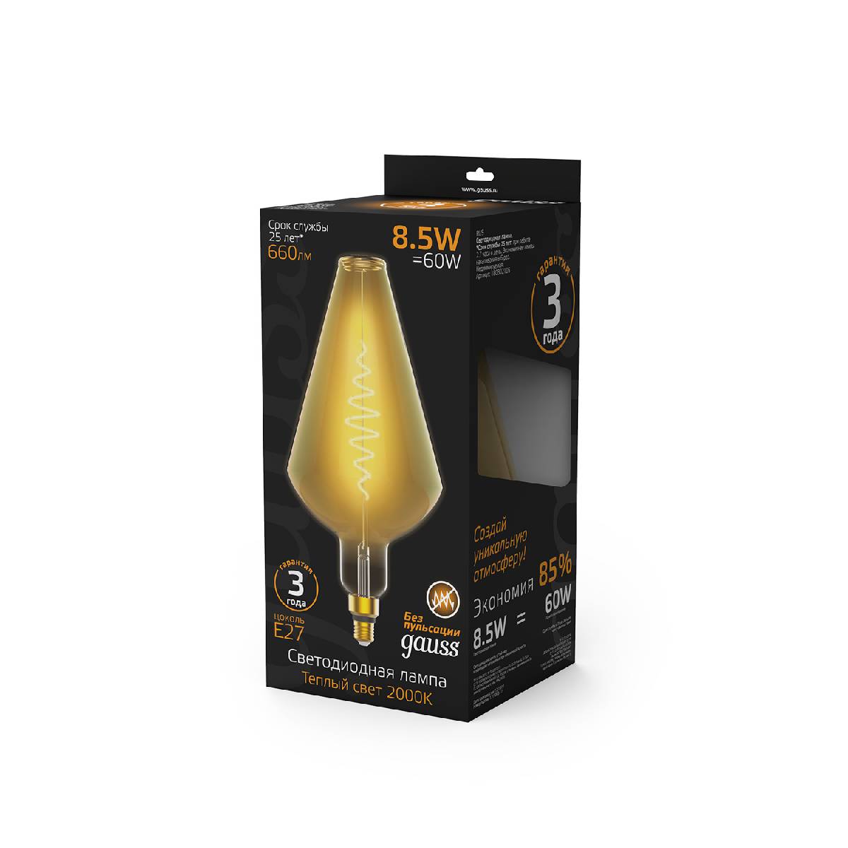 Лампа светодиодная филаментная Gauss E27 8,5W 2000K янтарная 180802105
